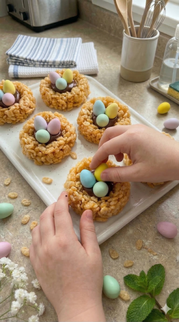 These easy Easter nests turn a classic treat into a fun holiday activity. Kids shape the nests and place candy eggs inside. That adds creativity while still keeping the recipe simple.