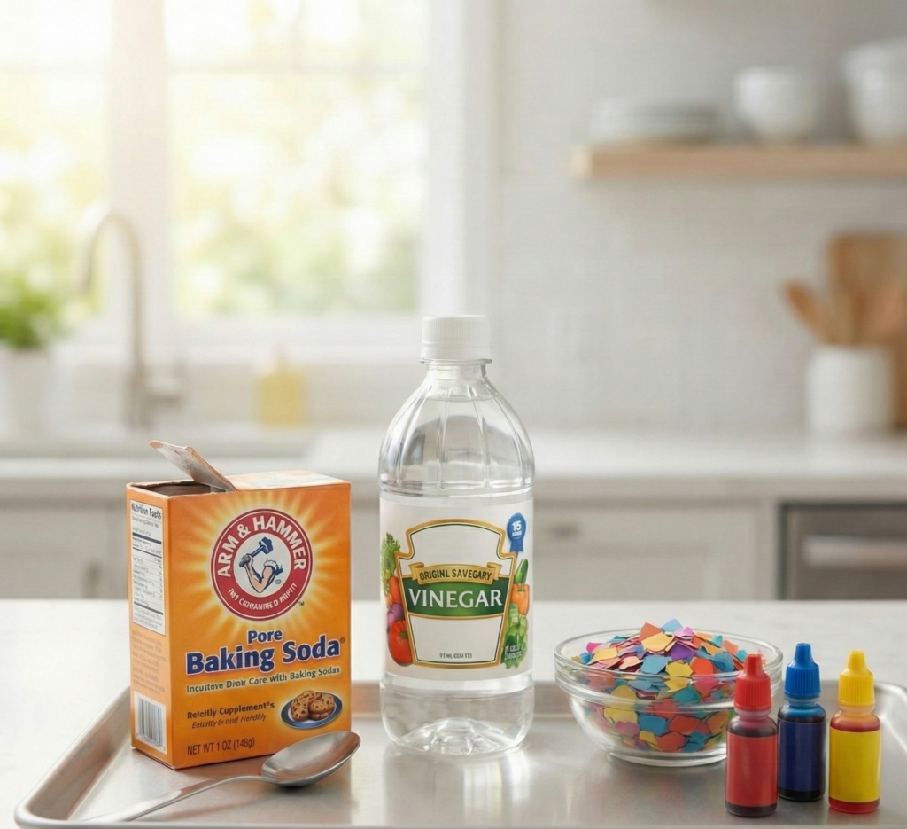 To start things off, if you are looking for science experiments for kids at home that are fun, colorful, and easy to set up, Fizzy Confetti Eruptions is the perfect activity. This baking soda and vinegar experiment turns your kitchen into a mini science lab while keeping kids entertained for a long time. By the end of this activity, your child will feel like a real scientist.