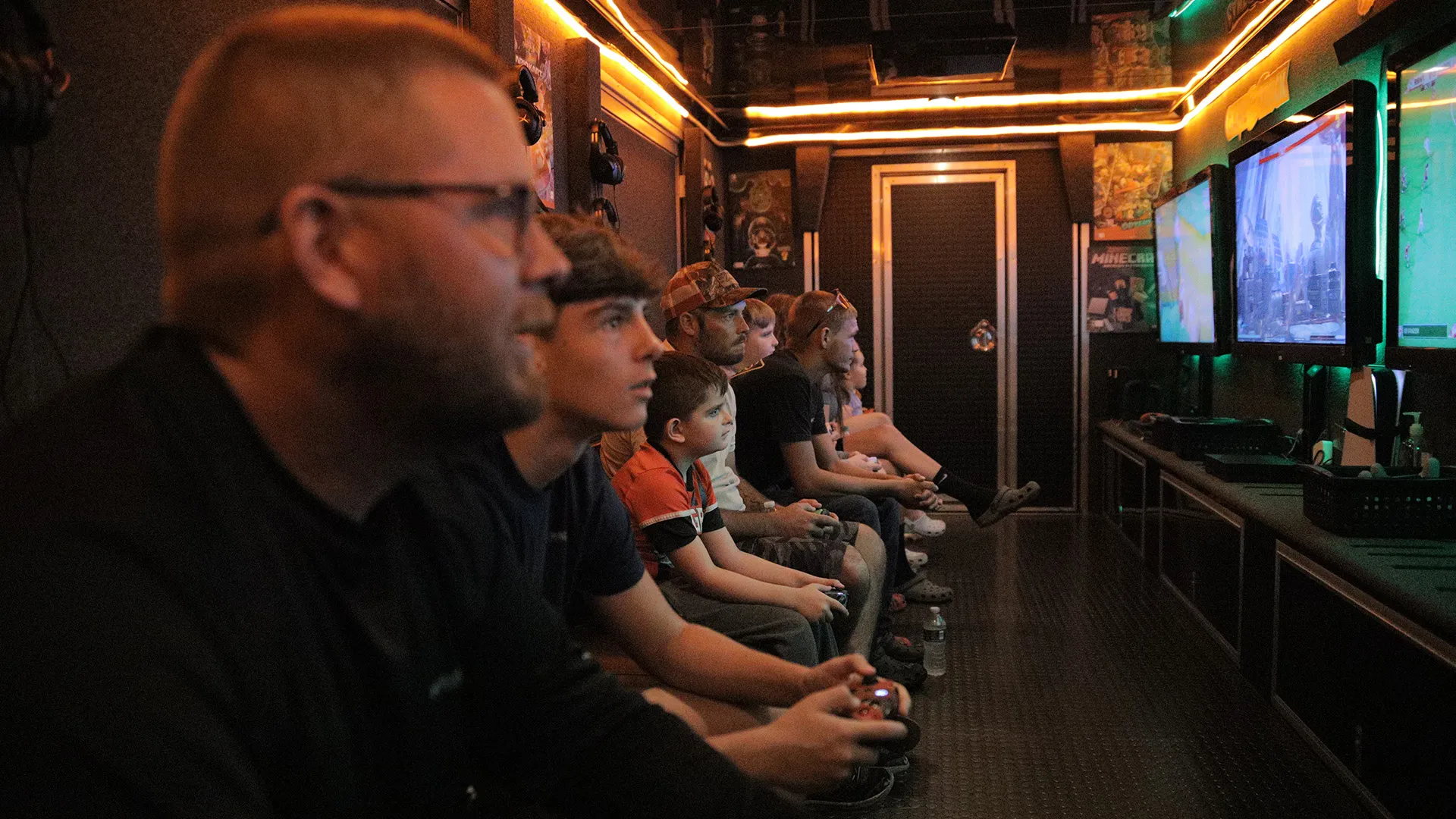 The full gaming rig, delivered to your driveway. 200+ game titles across multiple consoles, massive screens, surround sound — all inside a climate-controlled theater. Up to 24 kids playing at once with tournament brackets, free play, and cooperative challenges.